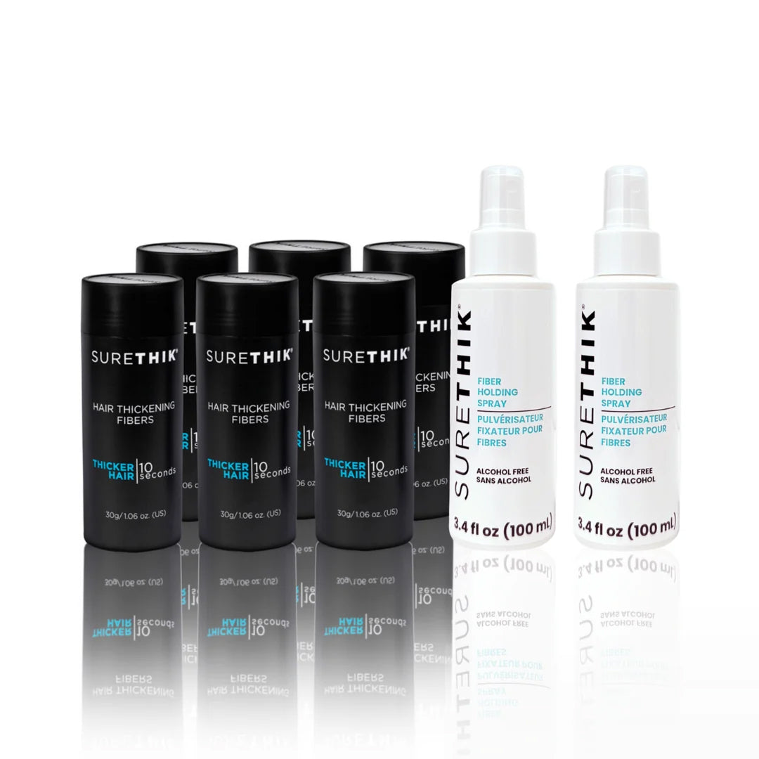The SURETHIK® Extra Value Package is designed for users who want natural-looking, fuller hair while maximizing value. This bundle includes multiple containers of premium SURETHIK® Hair Fibers and our professional-grade Holding Spray, giving you everything you need for long-lasting, smudge-proof coverage at a fraction of the cost of buying individual items.